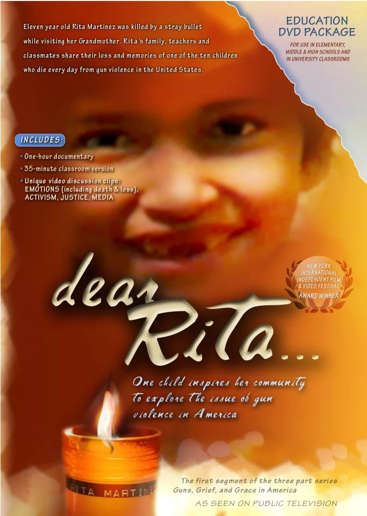 Dear Rita is a one-hour ethnographic account of one family’s loss, which embodies the spirit of so many others in the United States. On a Saturday in March of 2000, Rita Martinez prepared her Grandma’s favorite lunch – a grilled cheese sandwich. Rita kissed her Grandma and went into the bedroom to watch cartoons. Moments later, a bullet broke the front window, tore through the bedroom wall and lodged in her head, killing the eleven-year-old. Rita’s mother vowed to fight for sensible gun laws, a promise that put her on the bus to the Million Mom March. For the remainder of the year, Rita’s family, teachers and classmates opened their lives and hearts to us, in hopes that others will see and hear how the horrific details of gun violence impact families, friends and society. Rita’s short, beautiful life and the sense of loss and grief shared by those who knew and miss her inspires audiences of all ages to change this picture. In a time when many of us are numbed to accounts of “another shooting,” the intimate, honest and emotional testimony compels viewers to acknowledge our collective grief, as citizens of a country where 10 children die from gun violence every day.